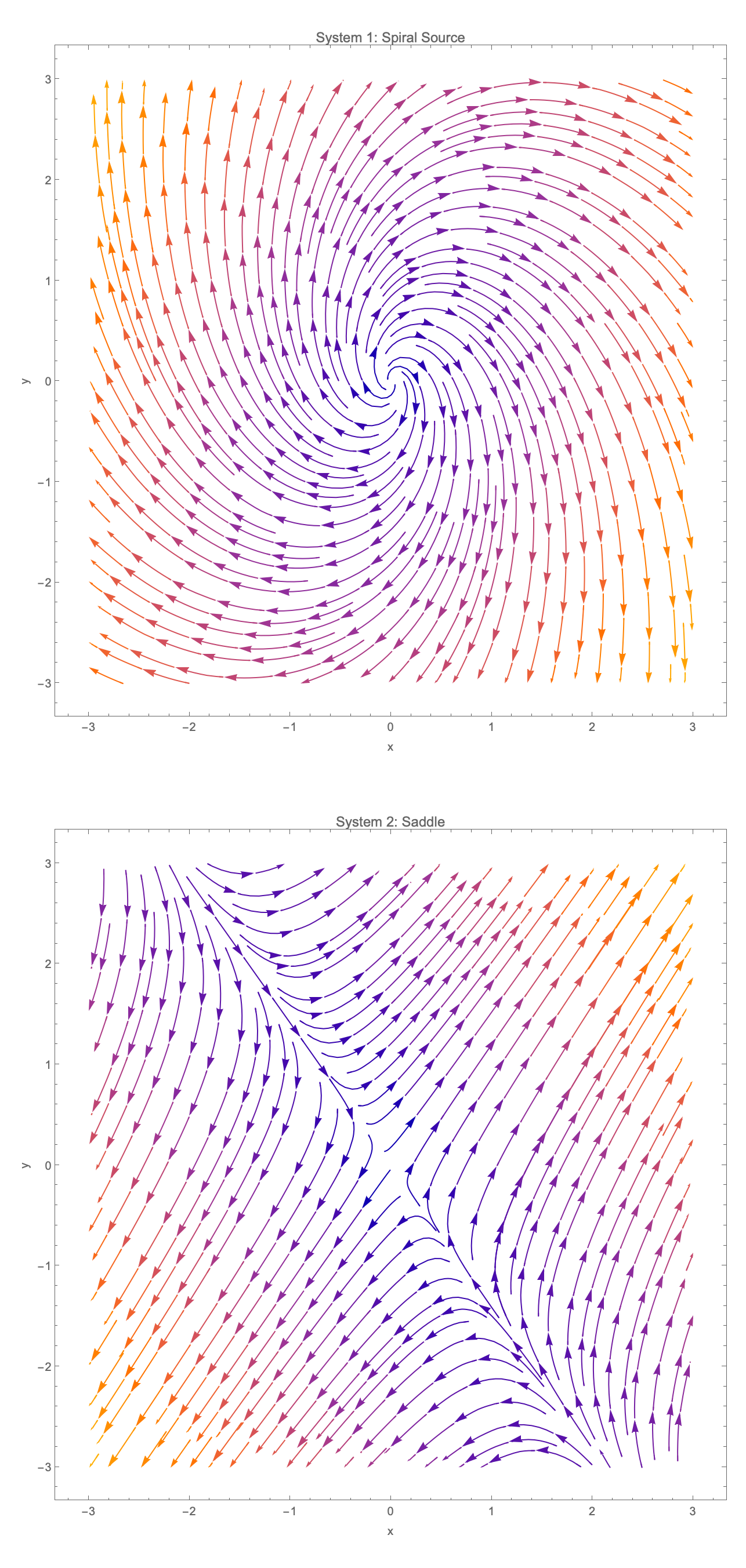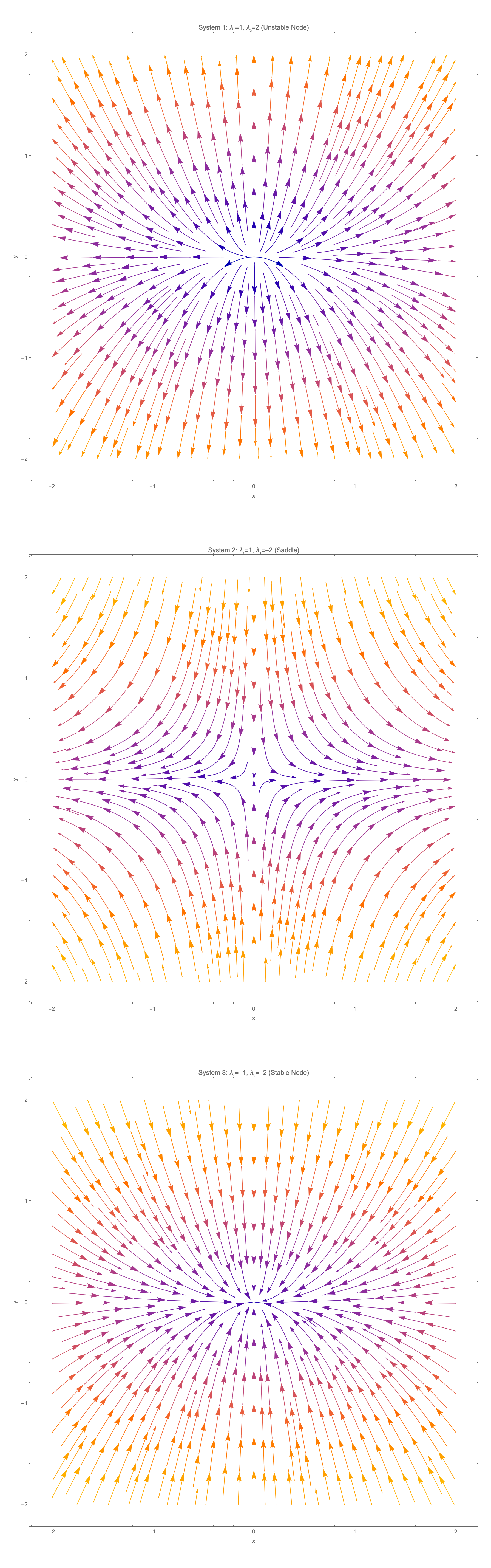 - 求解三个系统,并根据解的表达式对相图作出解释。