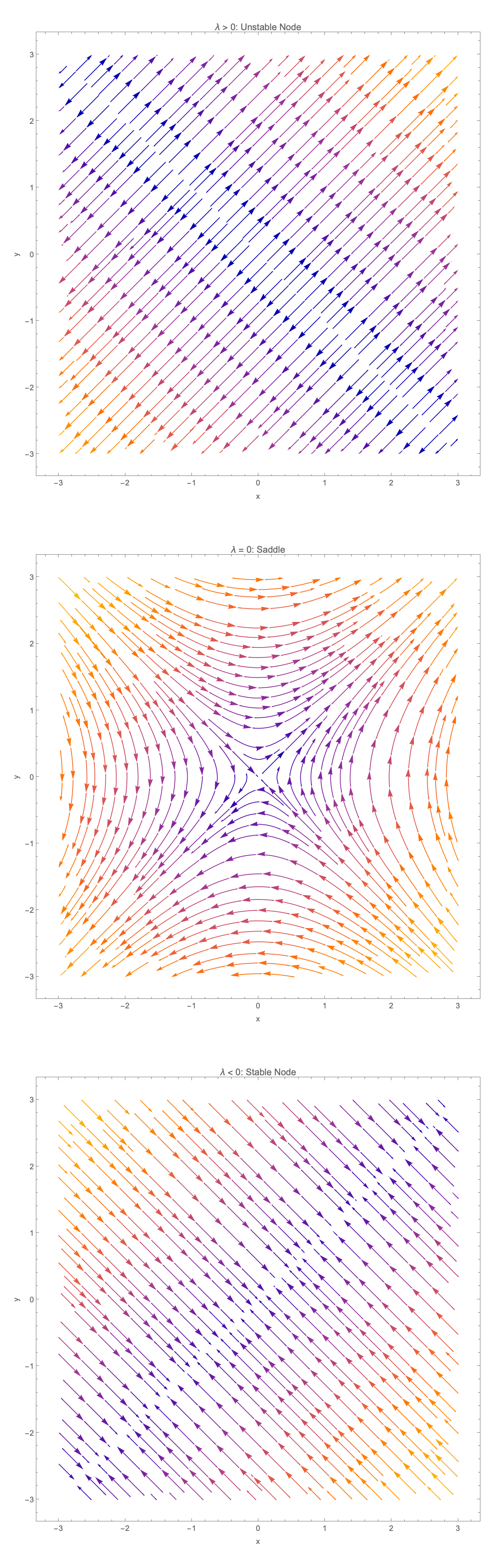 - λ > 0:特征值 > 0 → 所有轨迹远离原点 → 不稳定结点。