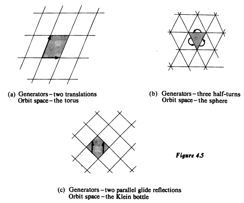 是一个凸多边形基本区域,且 $G$ 是平面对称群的一个有限指数子群。$\mathbb{E}^2/G$ 的紧致性保证该区域有界。平面晶体学群可完全分类,共 17 个不同同构类。高维晶体学群可类似定义,对固定维数,其同构类数目有限。