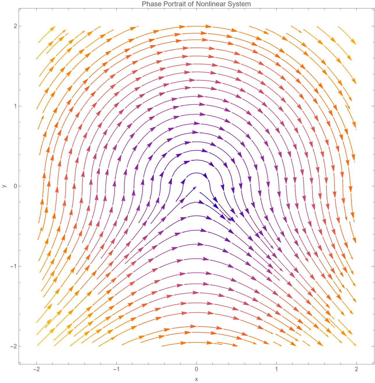 - 由于切向量的 $x_3$ 分量为零,解轨迹被限制在初始 $x_3$ 值的水平面(即 $x_3 = c_3$)上。因此,轨迹在三维相空间中是一个二维平面上的曲线。
