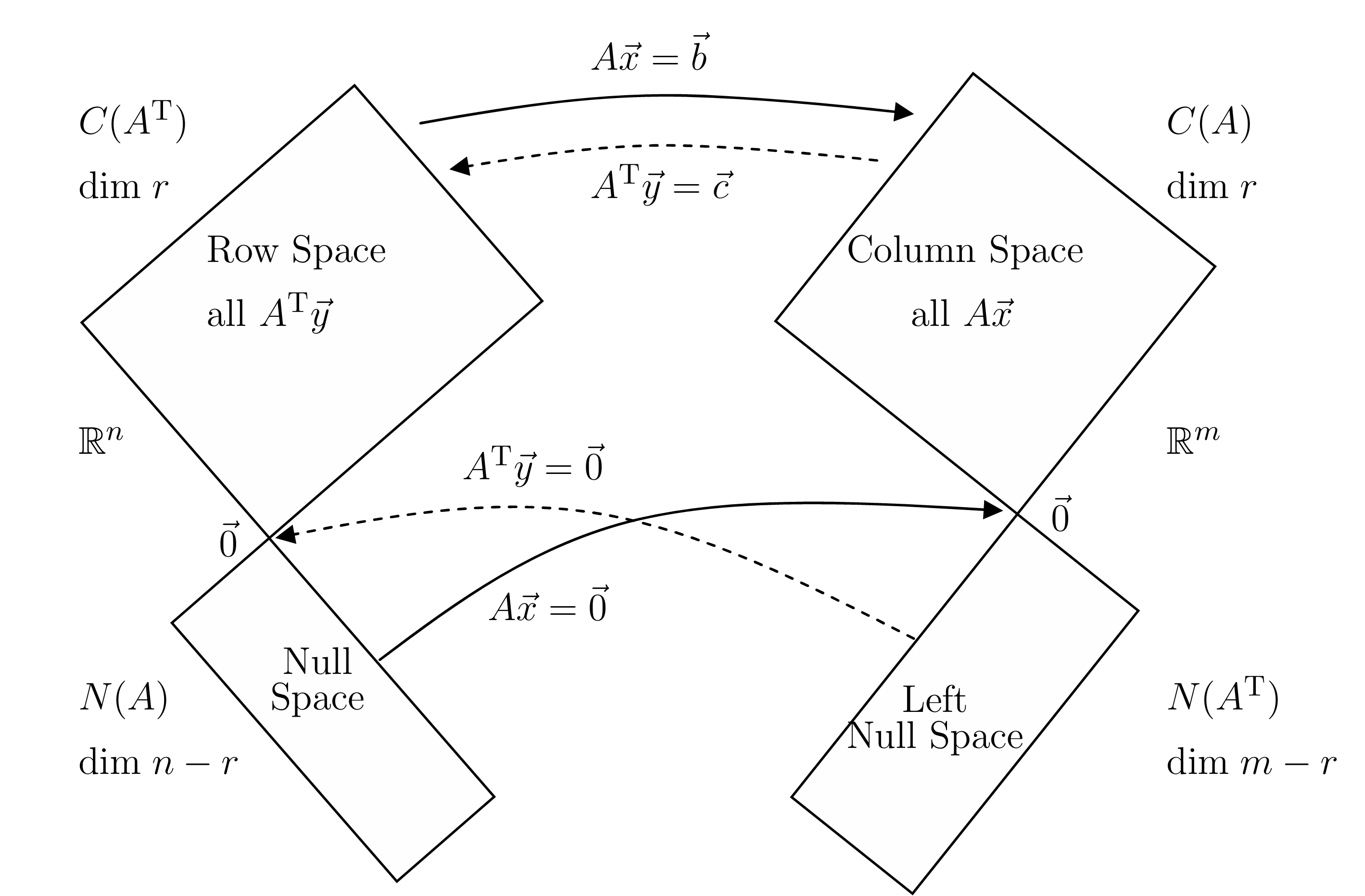 从对偶空间的视角来看,矩阵的行空间、列空间、核空间和左零空间之间存在着深刻的对称关系。对于一个$m \times n$矩阵$A$,其行空间是$A$的所有行向量张成的空间,属于$\mathbb{R}^n$;列空间是$A$的所有列向量张成的空间,属于$\mathbb{R}^m$。